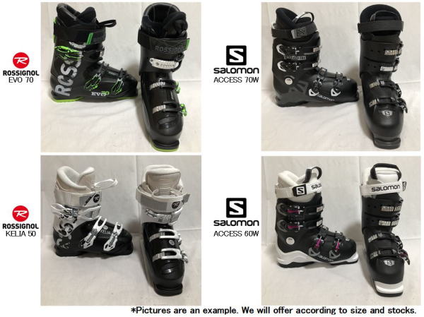 当館のスキーブーツはフレックスが柔らかく、足幅が広めの、固すぎず楽に履けるブーツを中心に取り揃えております。初心者から中級者向けです。
